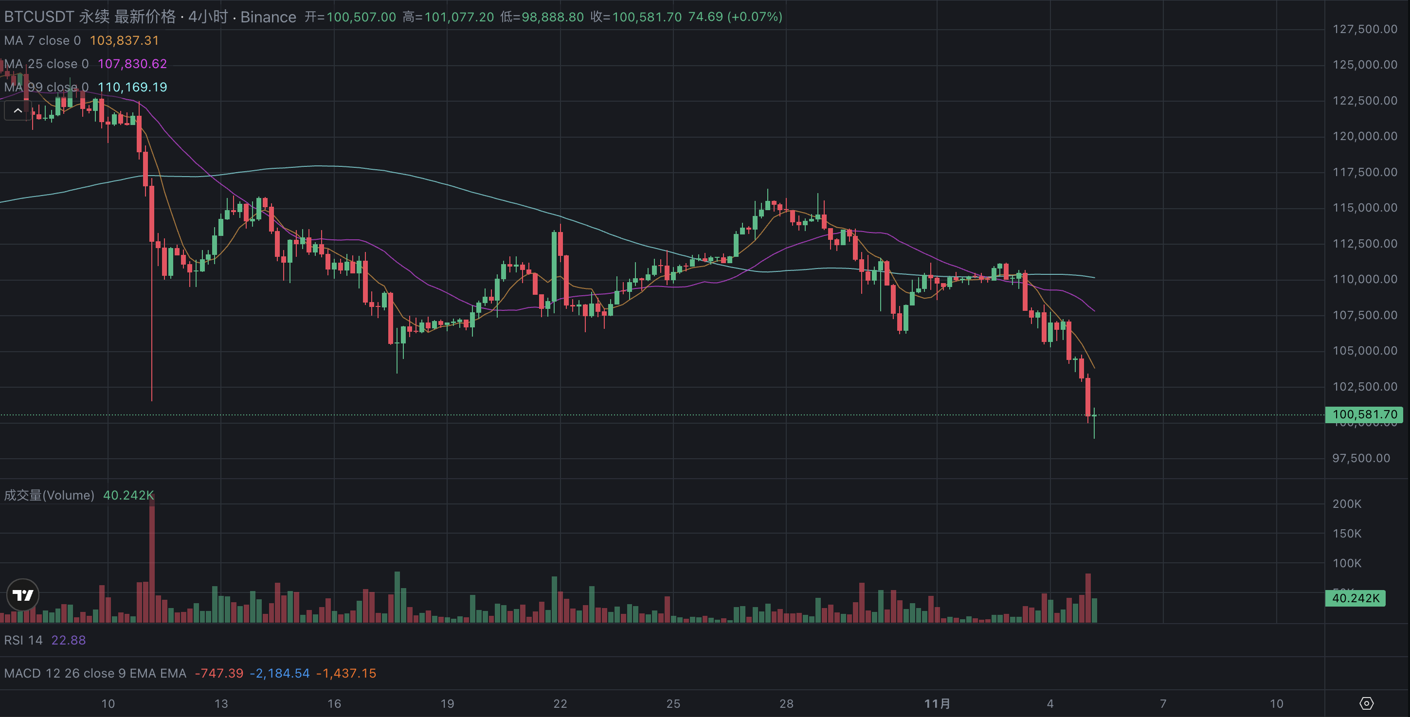 最近几天,比特币的回撤(价格短暂反弹)通常只有一两根K线,之后又继续下跌。目前价格大约是100,683美元,比前一天下跌了5.5%。来看看几个关键指标: