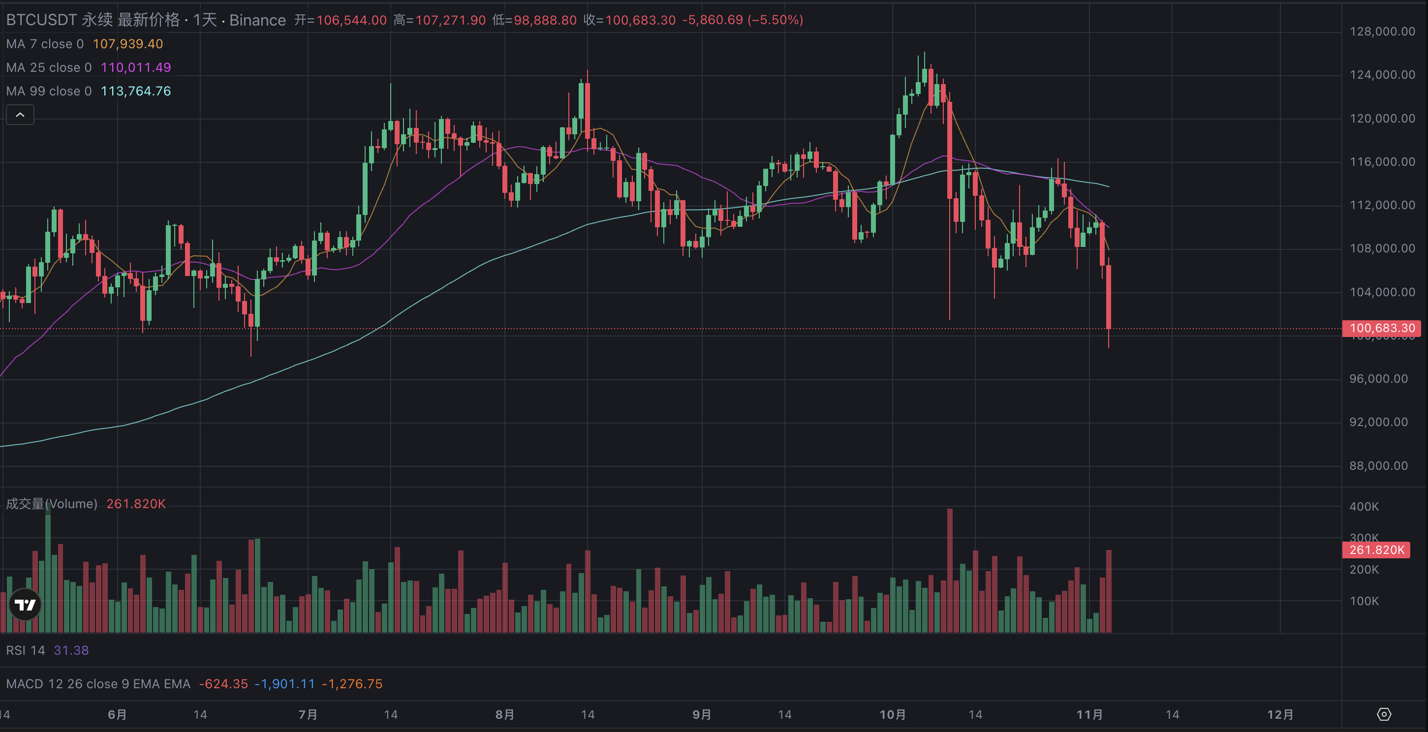 成交量达到261,820千手,相对强弱指数(RSI)是31.38,显示有点超卖,MACD指标是负值。下方的K线有小尾巴,说明有买家试图支撑价格,但力量还不够让价格反转。从最高点126,000美元回落了大约26,000美元,现在已经触及100,000美元这个目标位,如果继续跌,可能下探到90,000美元。