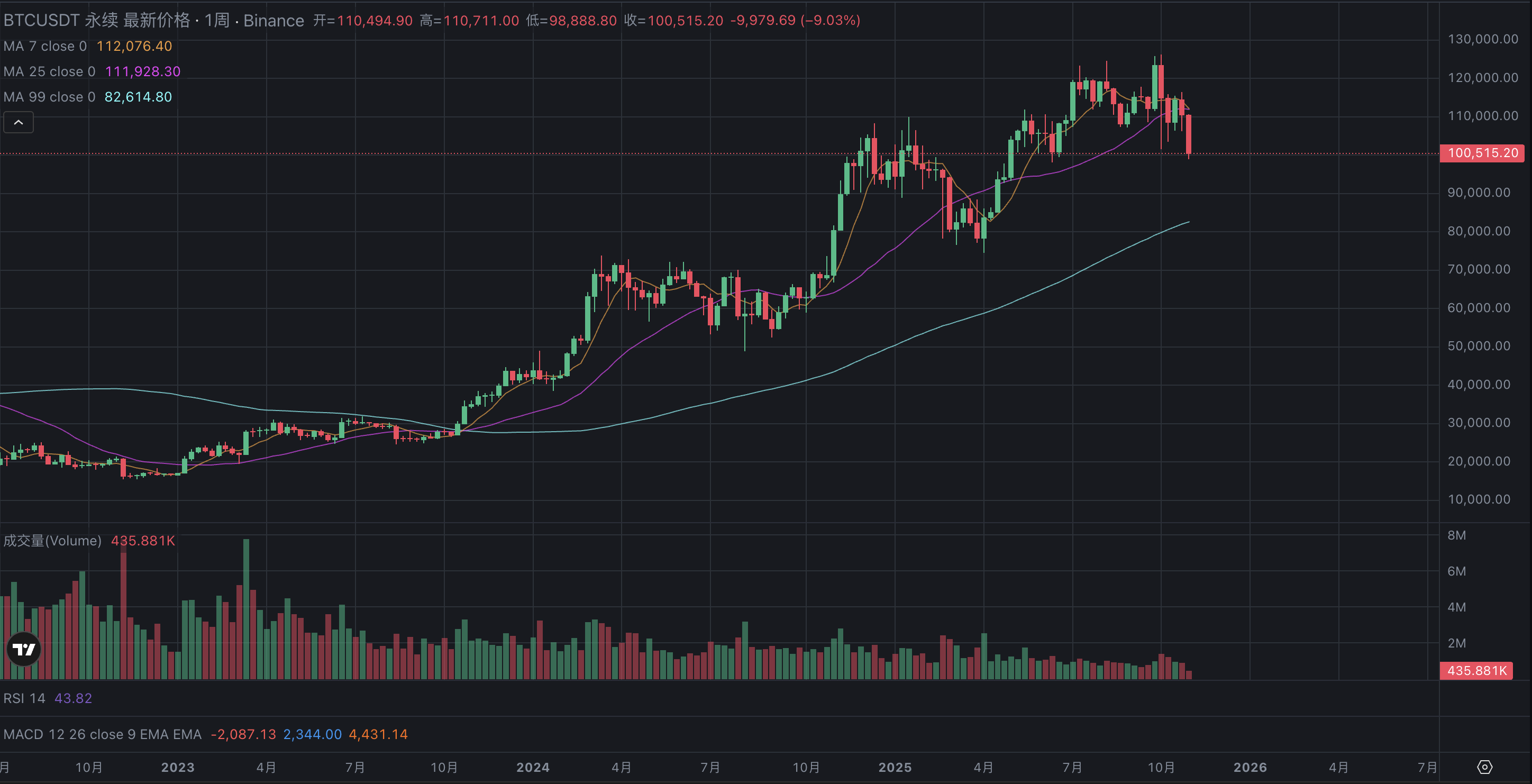 - 10月下旬-11月初回落:从126,000美元高点开始,价格连续两周下跌。第一周的大阴K线突破MA25,成交量激增,形成了第一个新低。第二周K线实体较小,带有下影线,显示短暂买盘抵抗,但未能守住,价格进一步跌至100,515美元,形成第二个新低,确认熊市启动。